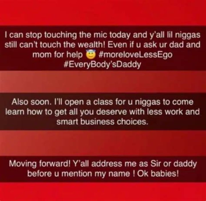 “I can quit contacting the mic today and you all lil niggas actually can’t contact the abundance! Regardless of whether u ask ur father and mother for help #moreloveLessEgo # Eve ryBody’s Daddy