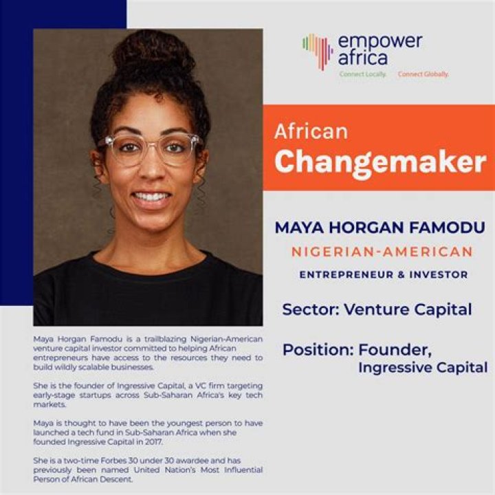 Maya Horgan Famodu is a Nigerian-American entrepreneur, founder and partner at Ingressive, a firm that provides market entry, technology research and market operations services for firms and businesses expanding into Africa. She also founded Ingressive Capital, a venture capital fund investing in Africa-based technology companies. She co-founded the High Growth Africa Summit, a two day conference on how to launch a high growth African business, and founded Tech Meets Entertainment Summit, a deal-focused event for African celebrities and tech companies to build revenue-generating partnerships.