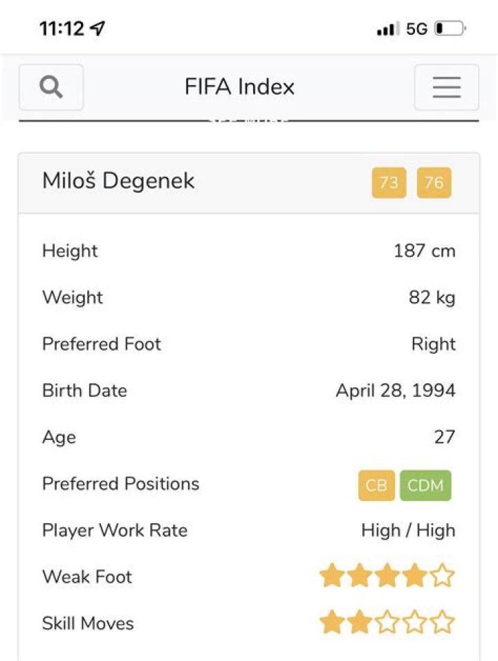 His right foot is his preferred shooting foot. His workrate is High / High. According to our database, Degenek stands 187 cm tall and weighs 82 kg. Milos Degenek is currently playing numbers 2 and 5.